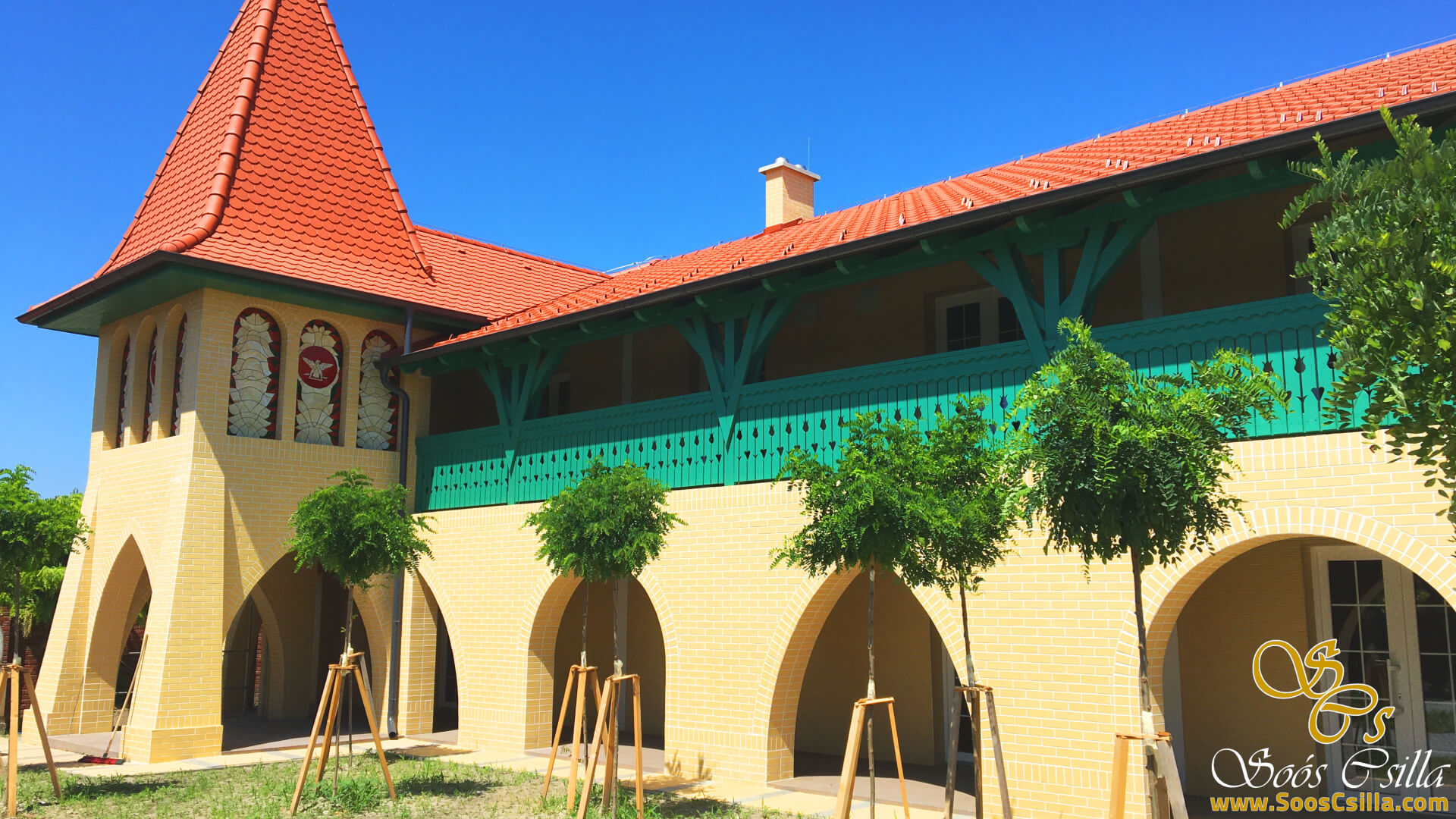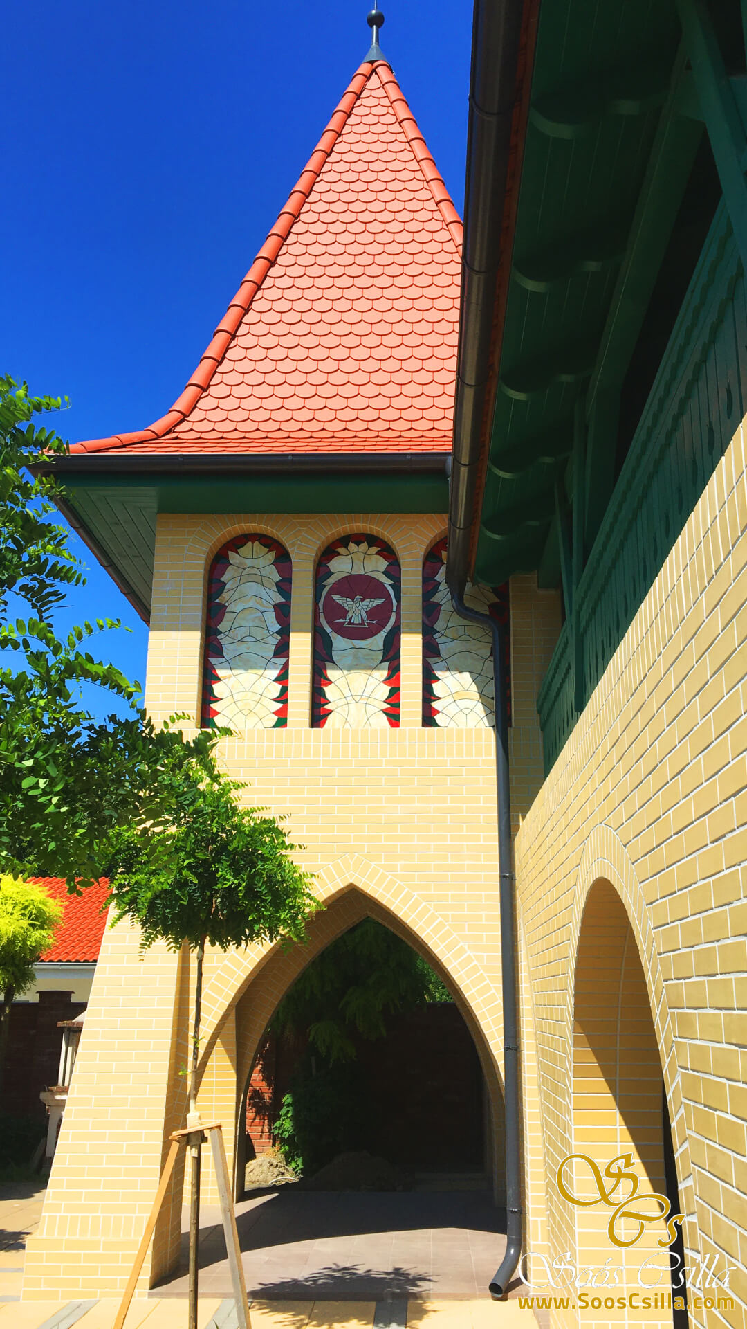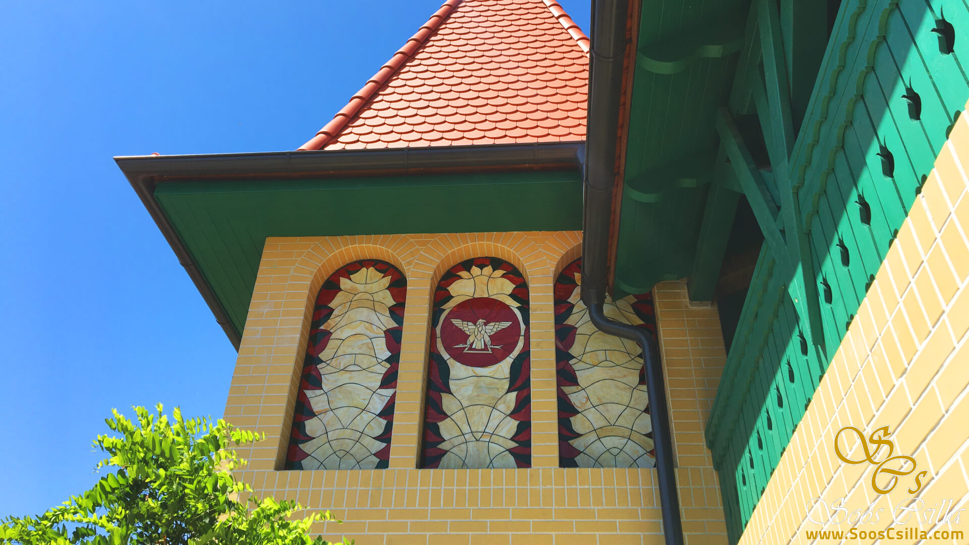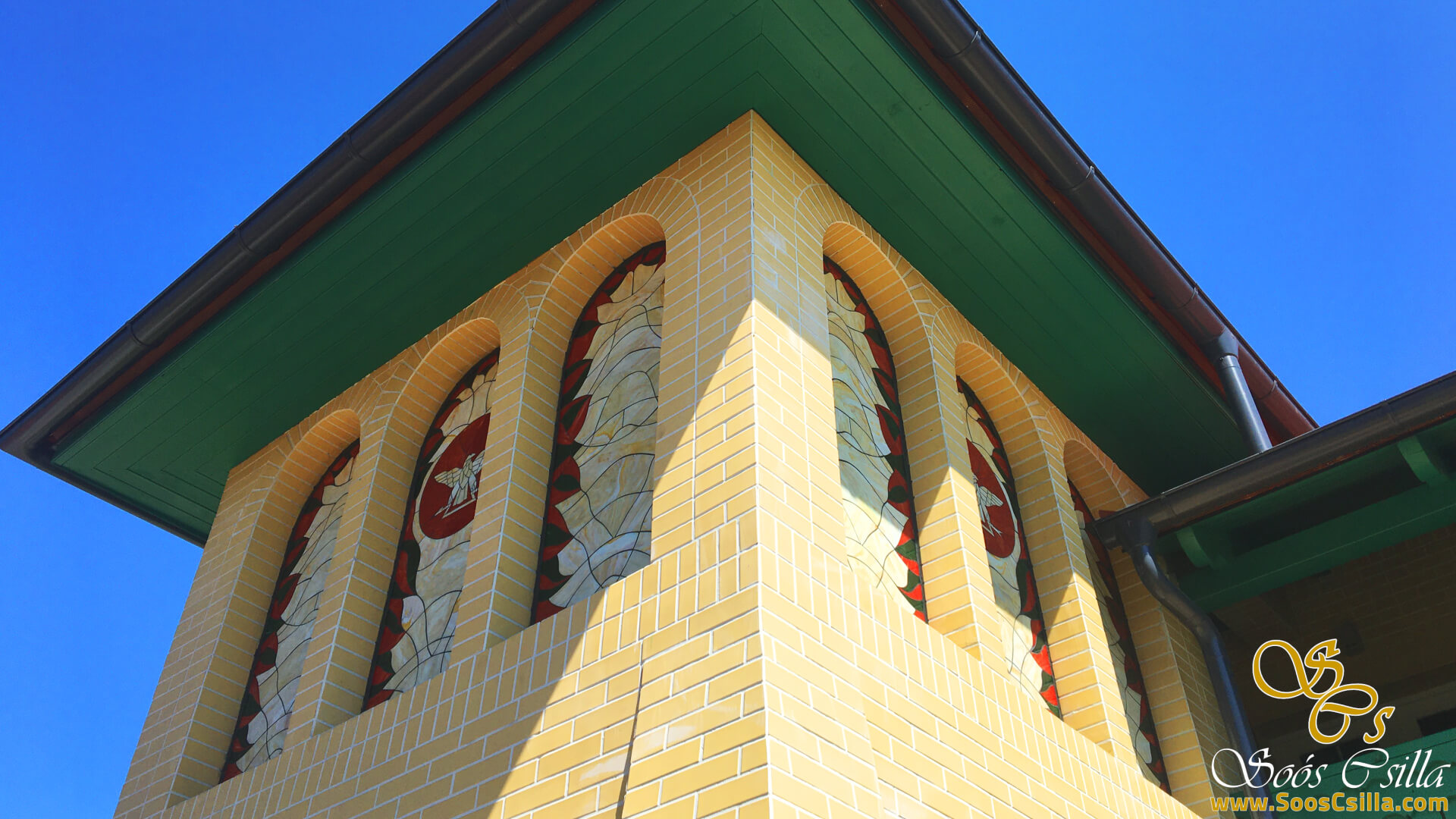 The building where the facade glass mosaic was made was designed by a well-known designer-architect: Nándor Litomericzky. On each side of the tower there are 3 arched mosaics, which depict the village’s coat of arms in the middle.