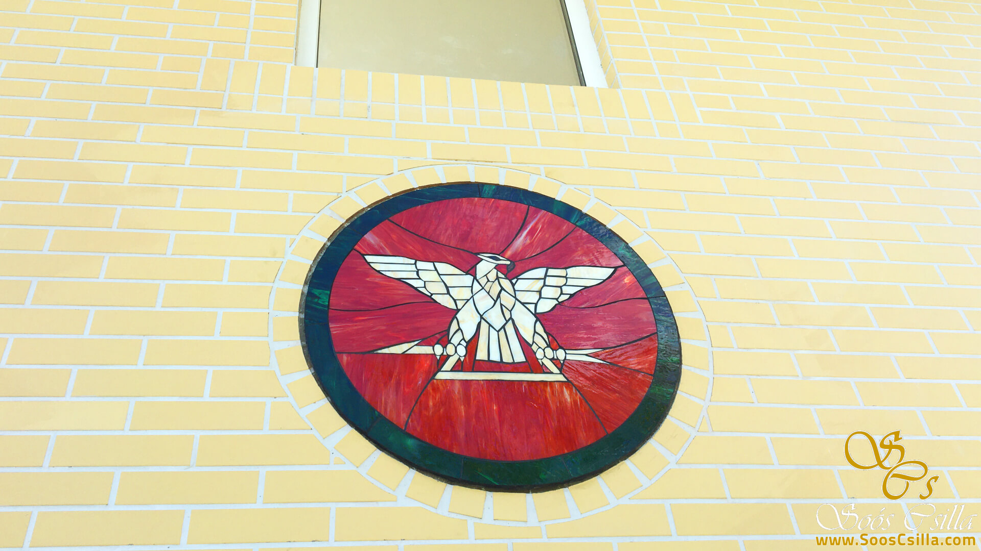 The images show the main coat of arms of the facade glass mosaic, which is an eagle bird. This coat of arms is the coat of arms of the village, and the glass work was made using a unique process: after the glass pieces were glued, the gaps were filled.