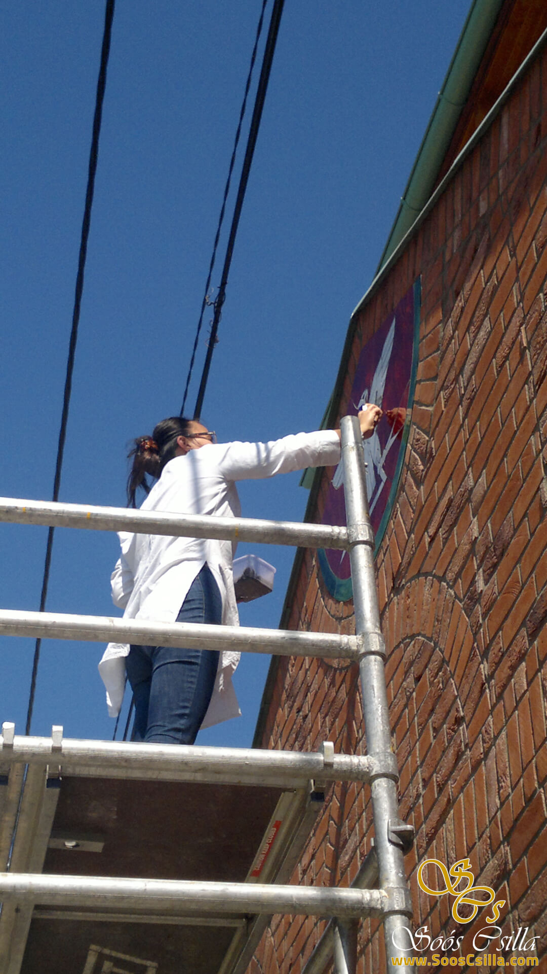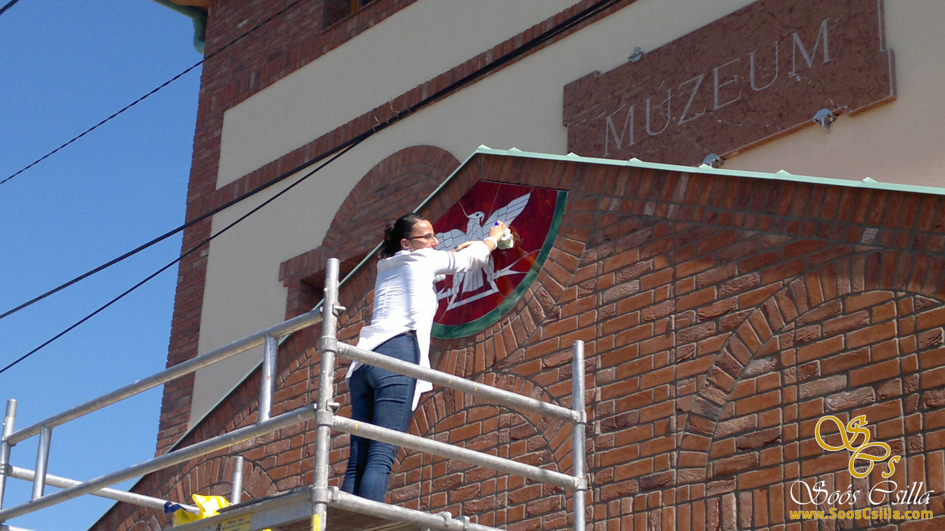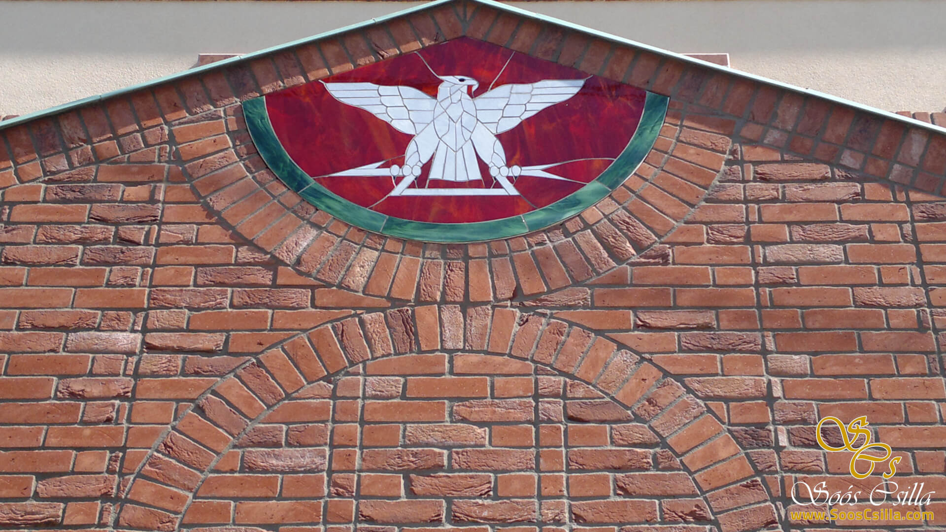 The mosaic was made for Izsa, for the facade of the Izsa museum. It is sunk into a 2 cm recess and depicts an Eagle bird, which is the crest of the village. The glass mosaics are glued to a base substrate one piece at a time. After the grouting, the part where the mosaic is to be glued and drilled was subsequently glued on site and then grouted. How do you like it?
