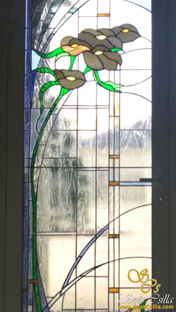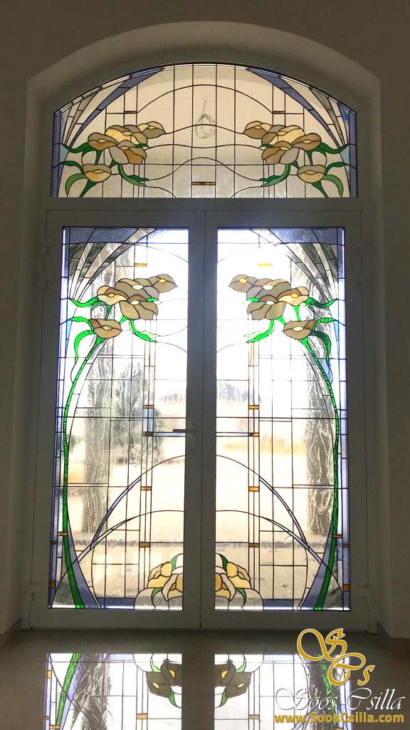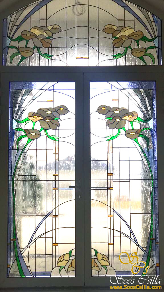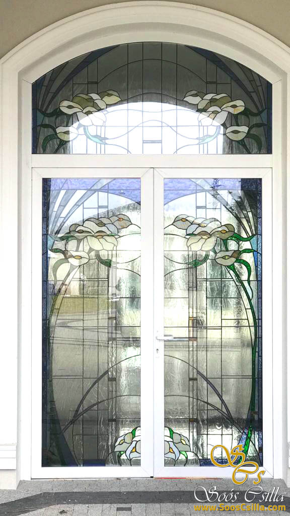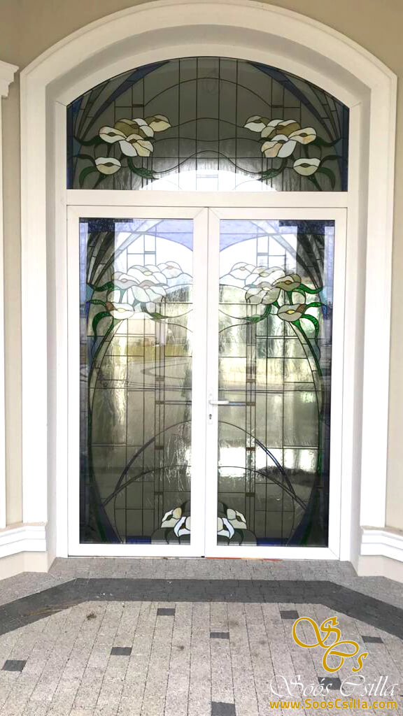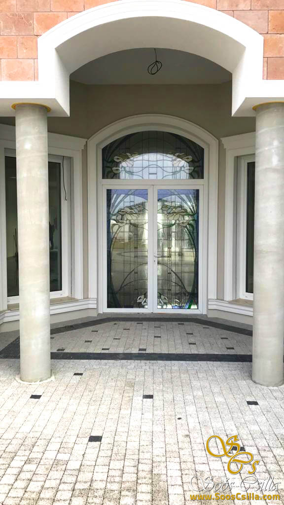 The stained glass work depicts flowers in the form of bone-white, refined colors. The pictures do not necessarily show it, but the stained glass was made on a much larger scale than usual; since the house is huge, so are its front doors.