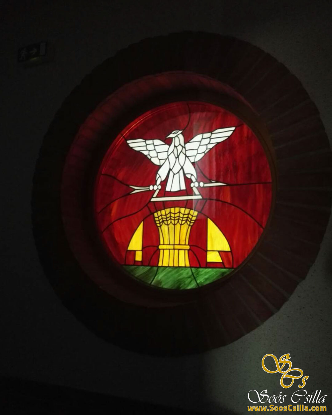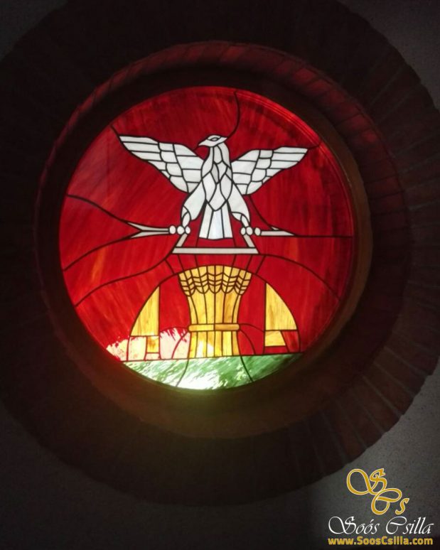 Stained Glass Logo Window at the Museum of Izsa by Stained Glass Artist, Csilla Soós.