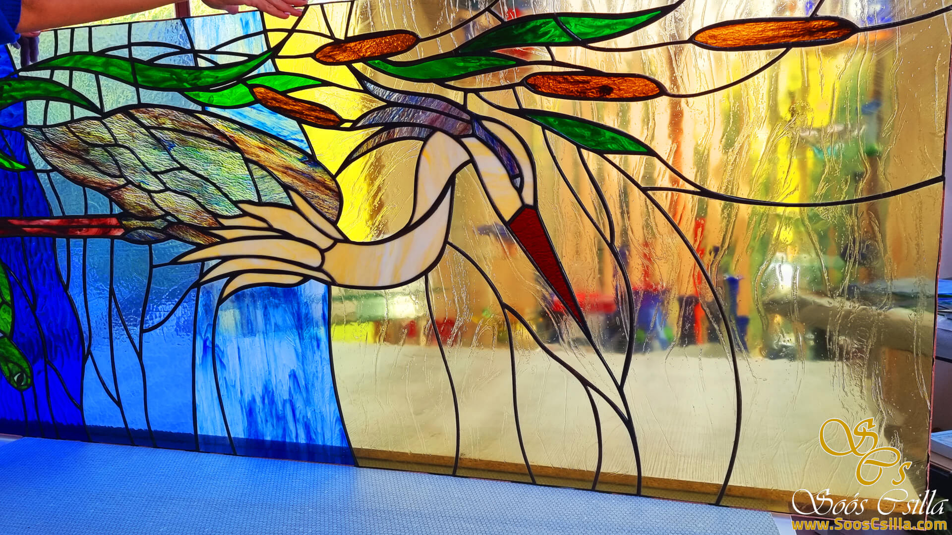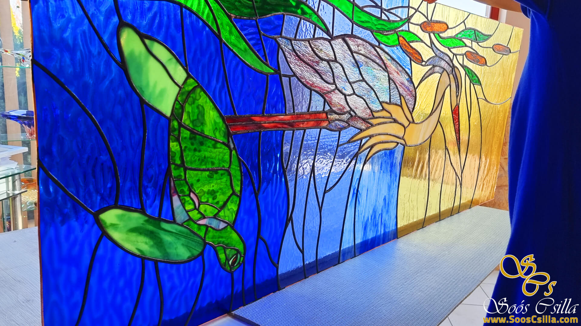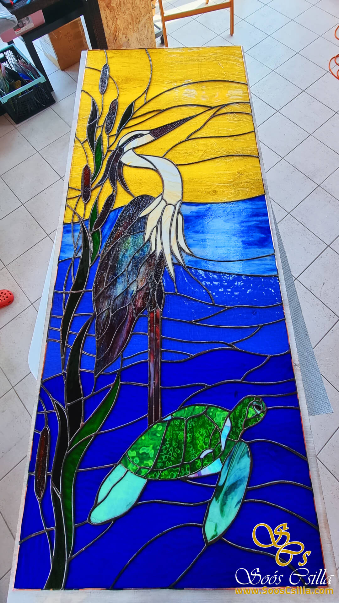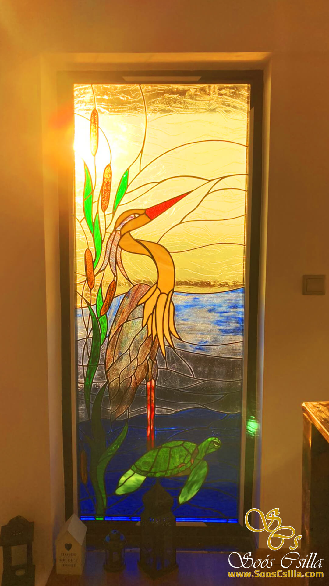 The gray heron with the turtle was made as stained glass for the living room of a lake house in Venice. It is always very challenging to solder thin glass surfaces – e.g. gray heron legs – because the glass here is very thin, which makes it very sensitive and can break extra easily during soldering. It looked amazing in the setting sun.