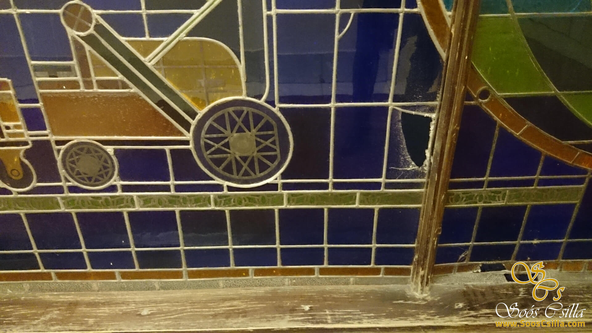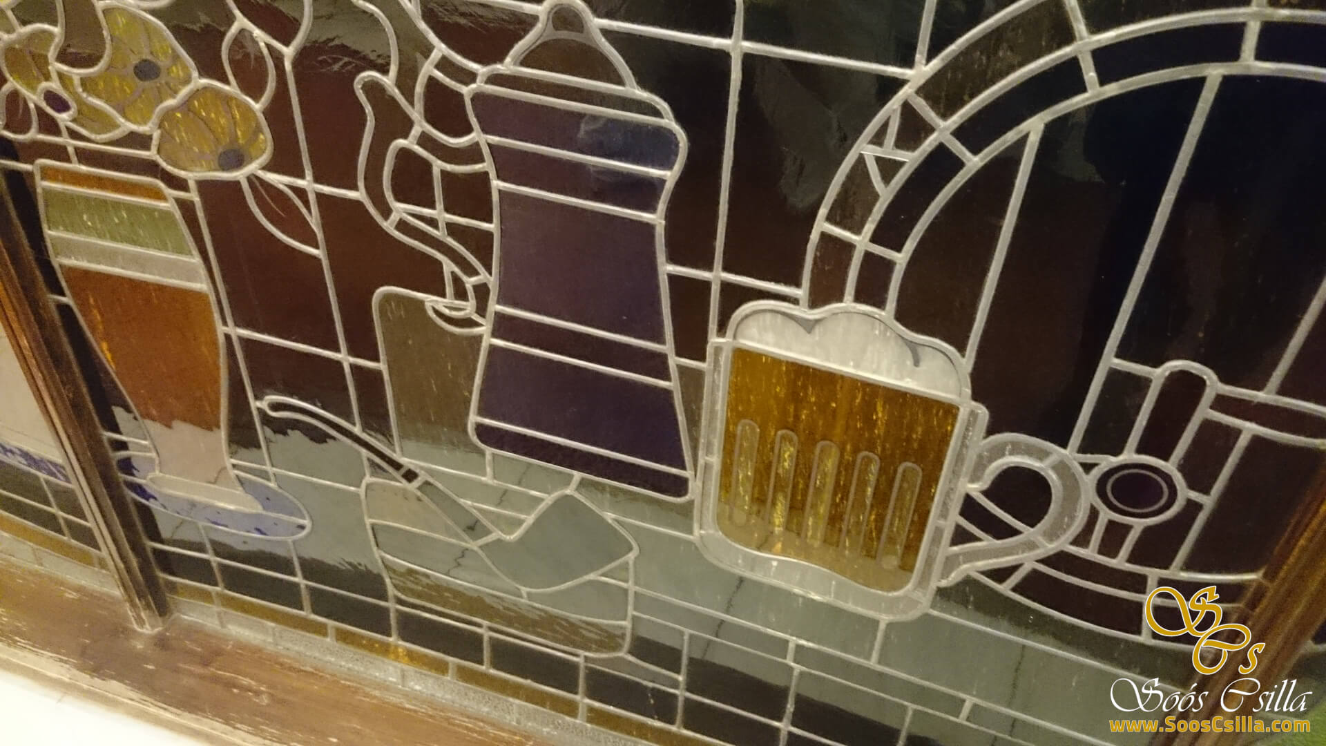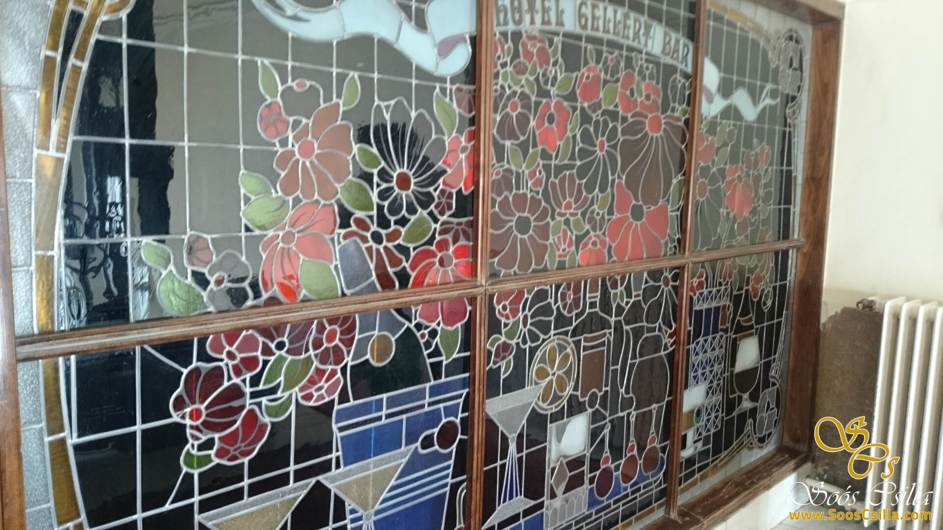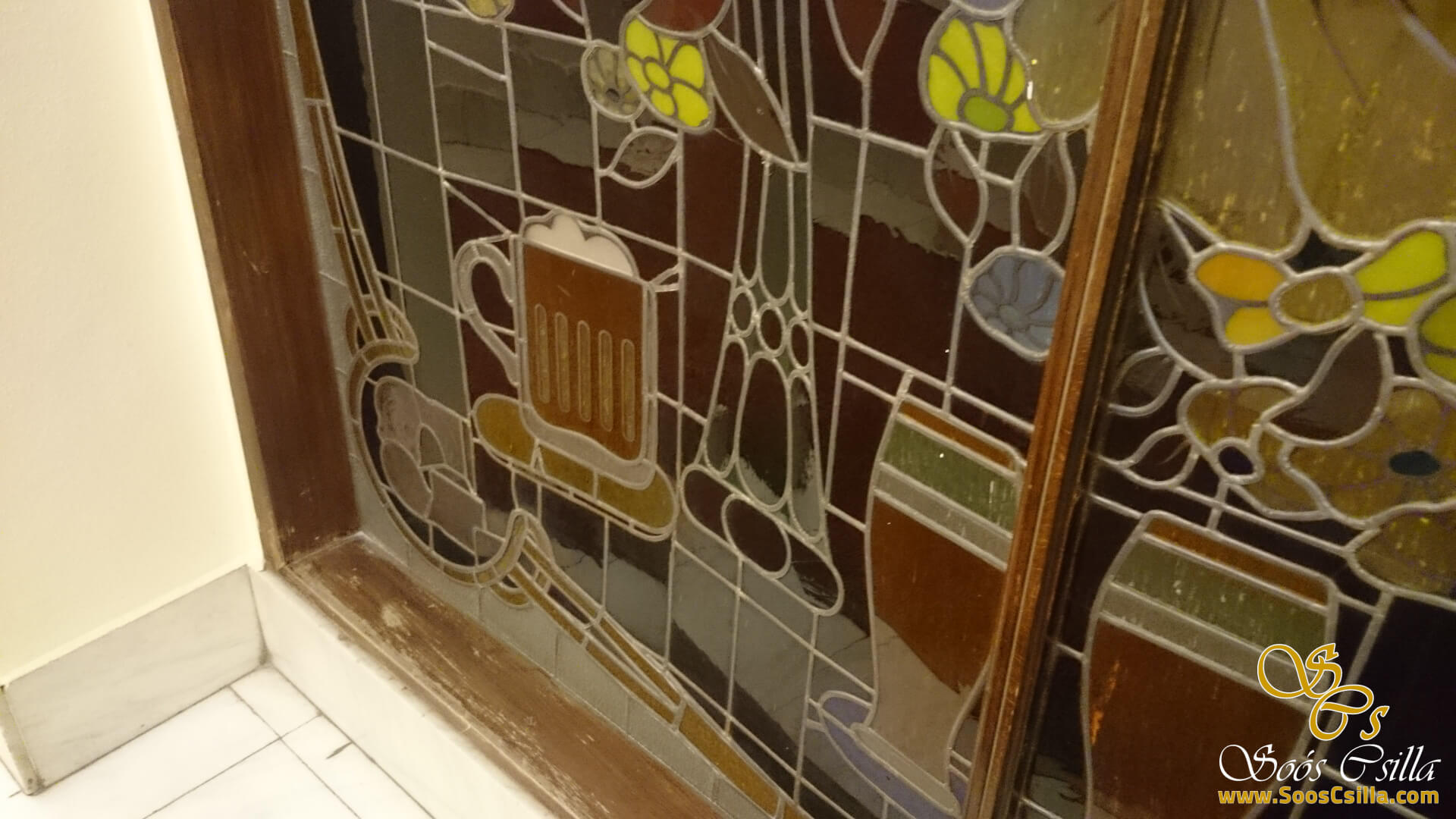 I performed the restoration of the stained glass on the glass surrounding the elevators in the main building of the deservedly famous Gellért Hotel in Budapest. The bottles depicted a variety of vehicles, food, and flowers. It was a great honor for me to work on the stained glass windows of the Gellért Hotel.