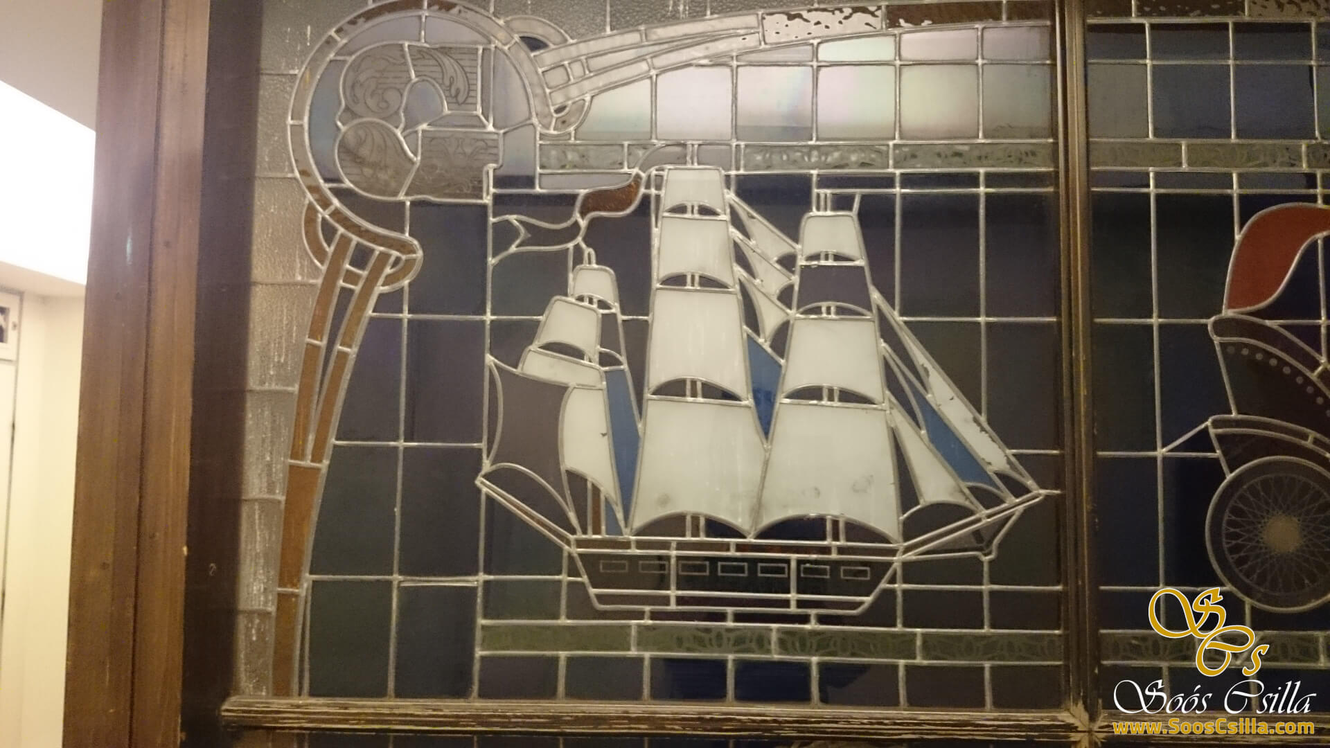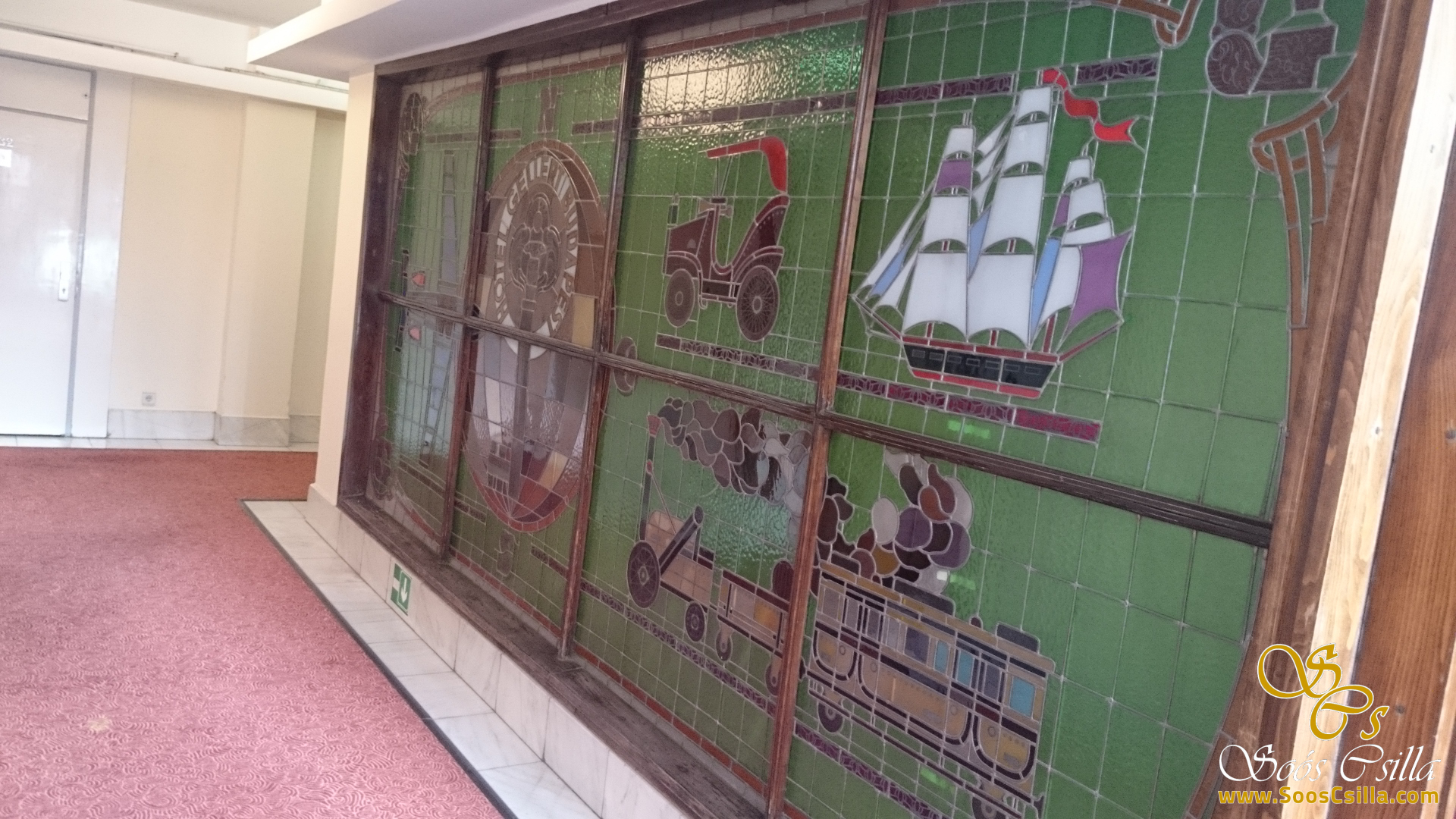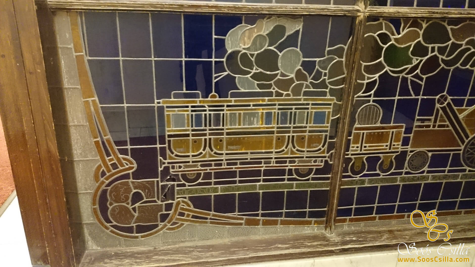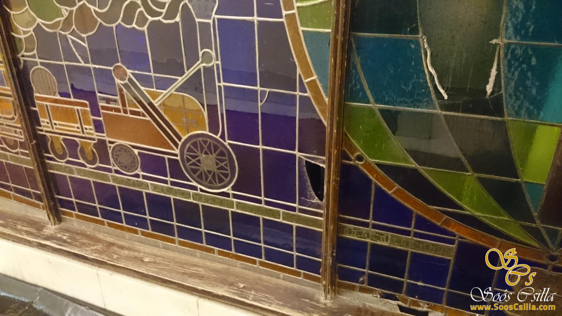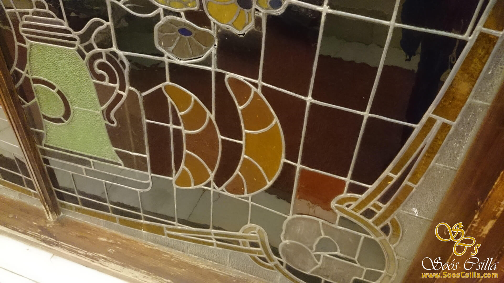 I performed the restoration of the stained glass on the glass surrounding the elevators in the main building of the deservedly famous Gellért Hotel in Budapest. The bottles depicted a variety of vehicles, food, and flowers. It was a great honor for me to work on the stained glass windows of the Gellért Hotel.