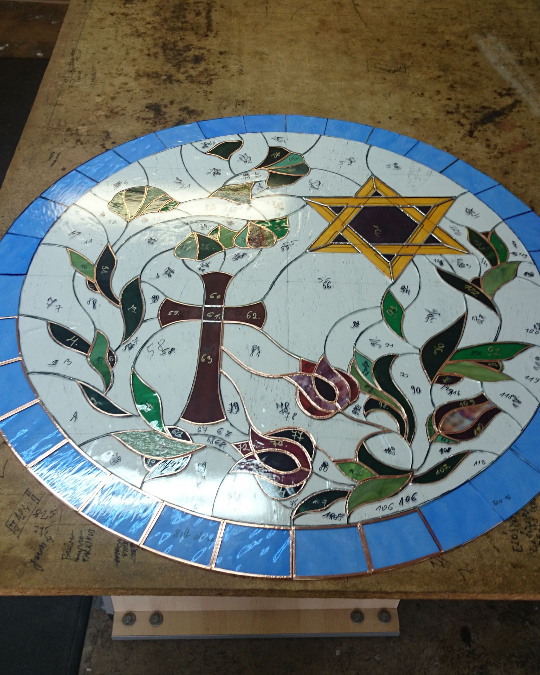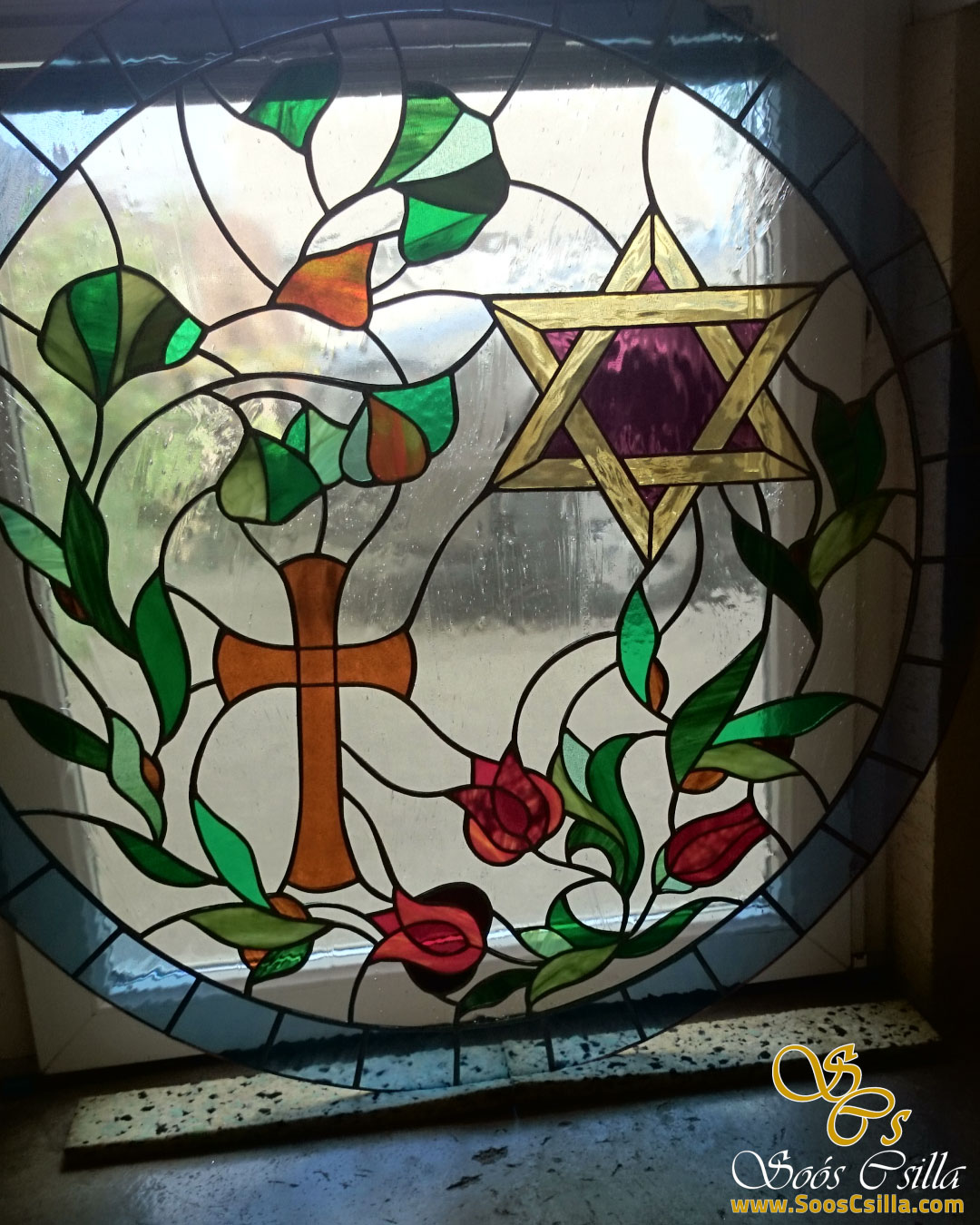 Stained Glass Window With Religious Symbols by Stained Glass Artist, Csilla Soós.